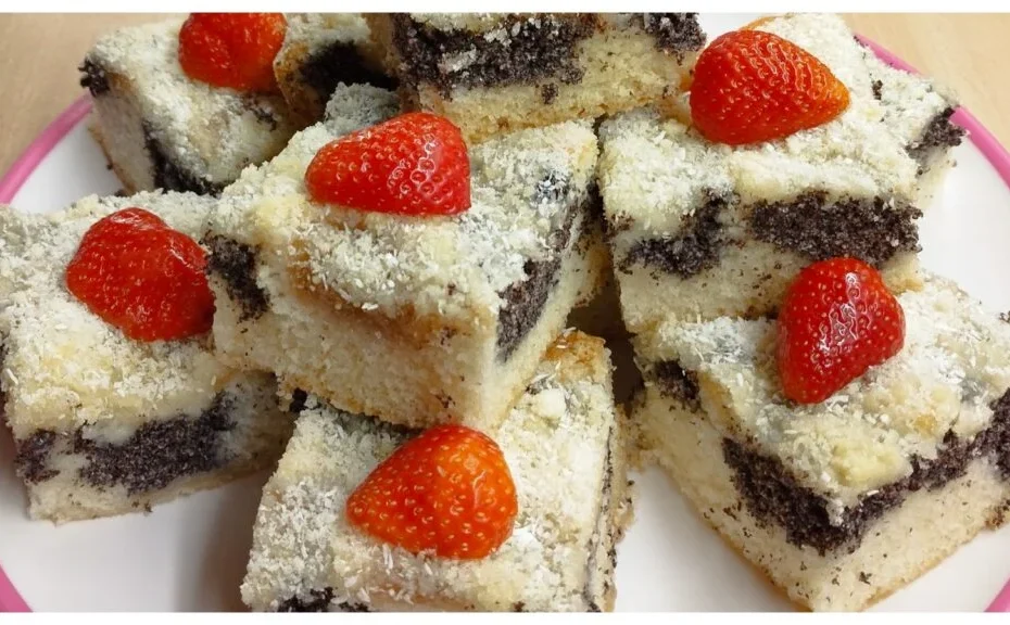 Maková buchta s hruškovým lekvárom, kokosom a posýpkou
